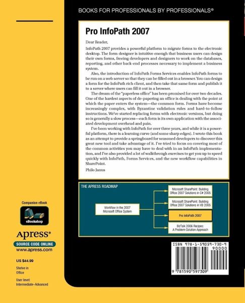 Pro InfoPath 2007 is an excellent book for developers trying to learn the scope and range of application forms that can be built with Microsoft Office InfoPath 2007. InfoPath is now in its second generation and it enables the creation of rich desktop and web forms using XML technologies and allows gathering of structured, business-critical information. Together with Microsoft Windows SharePoint Server 2007, InfoPath allows built-in integration with back-end processes, databases, and work flow, and provides developers with rich tools to build enterprise-wide forms solutions.