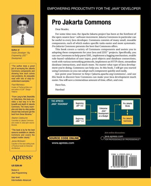 Jakarta Commons are easily reusable components that can quickly be put to good use in any server-side Java development undertaking. In fact, components are not big applications, but sleek code bits that perform specific tasks very well. This book provides much-needed documentation and usage information about the popular sub-projects forming Jakarta Commonsso that you can efficiently incorporate them into Java applications.