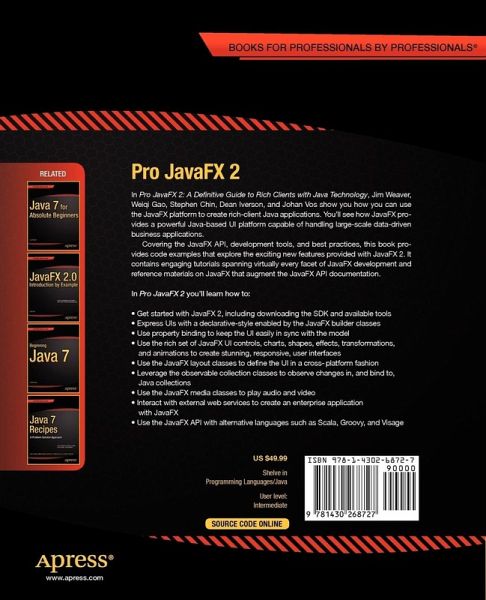 In Pro JavaFX 2: A Definitive Guide to Rich Clients with Java Technology, Jim Weaver, Weiqi Gao, Stephen Chin, Dean Iverson, and Johan Vos show you how you can use the JavaFX platform to create rich-client Java applications. You'll see how JavaFX provides a powerful Java-based UI platform capable of handling large-scale data-driven business applications.
