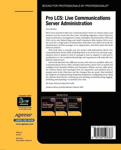 Pro LCS: Live Communications Server Administration will guide you on how to best leverage Microsofts Live Communications Server 2005 (LCS) to improve your business communications. This information-packed volume includes everything you need to know about LCS, but were afraid to ask. This includes all the different clients that you can utilize and how you can best deploy them.