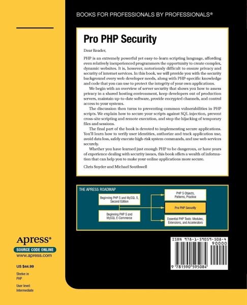 The Importance of Security.- Why Is Secure Programming a Concern?.- Maintaining a Secure Environment.- Dealing with Shared Hosts.- Maintaining Separate Development and Production Environments.- Keeping Software Up to Date.- Using Encryption I: Theory.- Using Encryption II: Practice.- Securing Network Connections I: SSL.- Securing Network Connections II: SSH.- Controlling Access I: Authentication.- Controlling Access II: Permissions and Restrictions.- Practicing Secure PHP Programming.- Validating User Input.- Preventing SQL Injection.- Preventing Cross-Site Scripting.- Preventing Remote Execution.- Enforcing Security for Temporary Files.- Preventing Session Hijacking.- Practicing Secure Operations.- Allowing Only Human Users.- Verifying Your Users' Identities.- Using Roles to Authorize Actions.- Adding Accountability to Track Your Users.- Preventing Data Loss.- Safely Executing System Commands.- Handling Remote Procedure Calls Safely.- Taking Advantage of Peer Review.