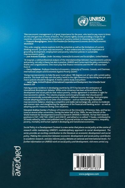 'At long last, a solid professional analysis of the interrelationships between macroeconomic policies and poverty, not only in theory but also in practice. UNRISD and Cornia merit the policy community's thanks and congratulations. One must pray that finance ministries and the IMF will now learn from it.' - Gerry Helleiner, Professor Emeritus in Economics, University of Toronto, Canada, and Chairman, International Lawyers and Economists Against Poverty (ILEAP)