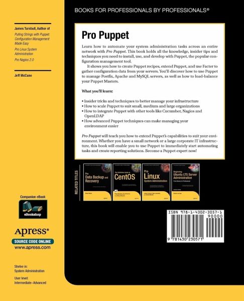 Pro Puppet is an in-depth guide to installing, using, and developing the popular configuration management tool Puppet. The book is a comprehensive follow-up to the previous title Pulling Strings with Puppet. Puppet provides a way to automate everything from user management to server configuration. You'll learn how to create Puppet recipes, extend Puppet, and use Facter to gather configuration data from your servers.