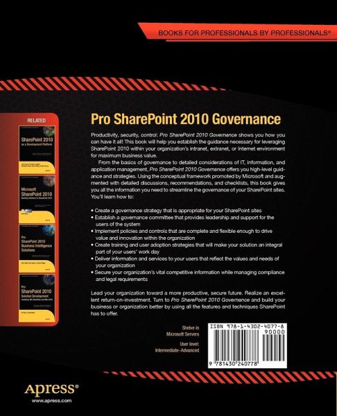 Pro SharePoint 2010 Governance is the first book on the market focusing exclusively on the essential guidance necessary for leveraging SharePoint 2010 within your organization's intranet, extranet or Internet environment for maximum business value. Effective governance allows your organization to promote the adoption of SharePoint's productivity-enhancing features while maintaining security and control over your organization's most vital information.