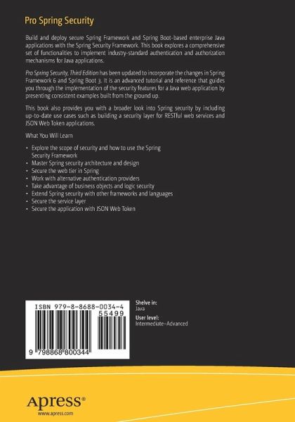 Build and deploy secure Spring Framework and Spring Boot-based enterprise Java applications with the Spring Security Framework. This book explores a comprehensive set of functionalities to implement industry-standard authentication and authorization mechanisms for Java applications. Pro Spring Security, Third Edition has been updated to incorporate the changes in Spring Framework 6 and Spring Boot 3. It is an advanced tutorial and reference that guides you through the implementation of the security features for a Java web application by presenting consistent examples built from the ground up. This book also provides you with a broader look into Spring security by including up-to-date use cases such as building a security layer for RESTful web services and JSON Web Token applications. What You Will Learn Explore the scope of security and how to use the Spring Security Framework Master Spring security architecture and design Secure the web tier in Spring Work with alternative authentication providers Take advantage of business objects and logic security Extend Spring security with other frameworks and languages Secure the service layer Secure the application with JSON Web Token Who This Book Is For Experienced Spring and Java developers with prior experience in building Spring Framework or Boot-based applications