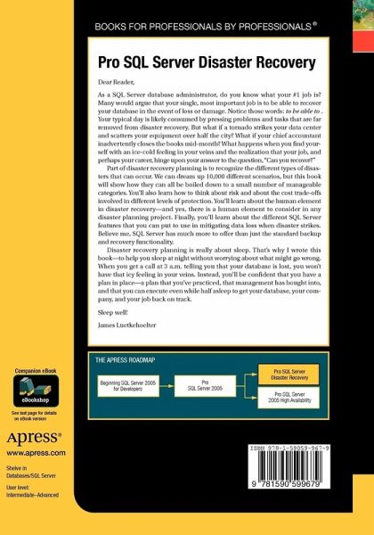 Many SQL Server features and technologies are, or can be put to good use in disaster recovery planning. In this book, you'll learn about powerful tools and features-such as Database Snapshots and Mirroring-for data backup and disaster recovery that are present in SQL Server 2005, and that are enhanced in SQL Server 2008. Also covered are common issues to expectwhen using these features. This book explores your options by examining the technical details of disaster recovery features and then applying that knowledge to practical scenarios.