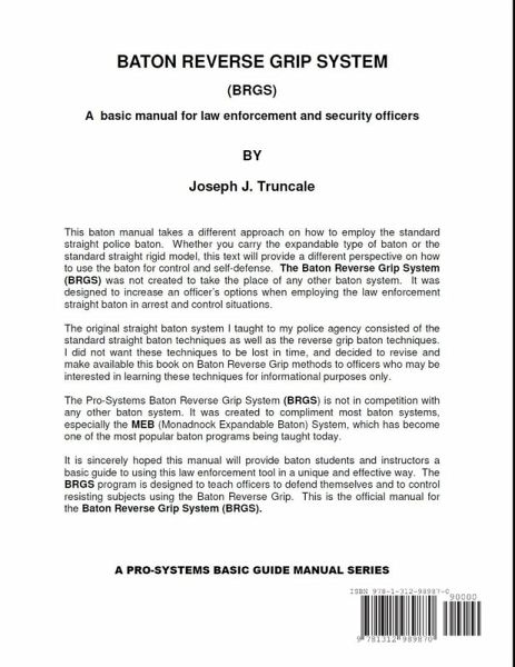 This baton manual takes a different approach on how to employ the standard straight police baton. Whether you carry the expandable type of baton or the standard rigid model, this text will provide a different perspective on how to use the baton for control and self defense. The Baton Reverse Grip System (BRGS)was not created to take the place of any other baton system. It was designated to increase an officer's options when employing the law rnforcement straight baton in arrest and control situations.