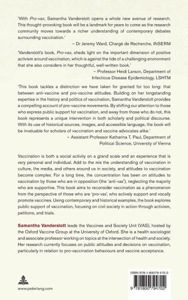«This book tackles a distinction we have taken for granted for too long: that between anti-vaccine and pro-vaccine attitudes. Building on her longstanding expertise in the history and politics of vaccination, Samantha Vanderslott provides a compelling account of pro-vaccine movements. By shifting our attention to those who express public support for vaccination, and away from those who do not, this book represents a unique intervention in both scholarly and political discourse. With its use of historical sources, images, and accessible language, the book will be invaluable for scholars of vaccination and vaccine advocates alike.»