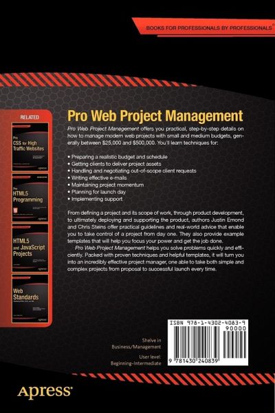 Pro Web Project Management is a collection of hard-won lessons the authors have learned managing modern web projects with small and medium budgets in a consulting environment. This isn't a book about project management theory. Pro Web Project Management tells how to create real deliverables, get answers from indecisive clients, manage wayward programmers, and use checklists to wow clients. This book is made up of real examples, real lessons, real documents, and real tips woven together into a step-by-step walkthrough of a project's life cycle.