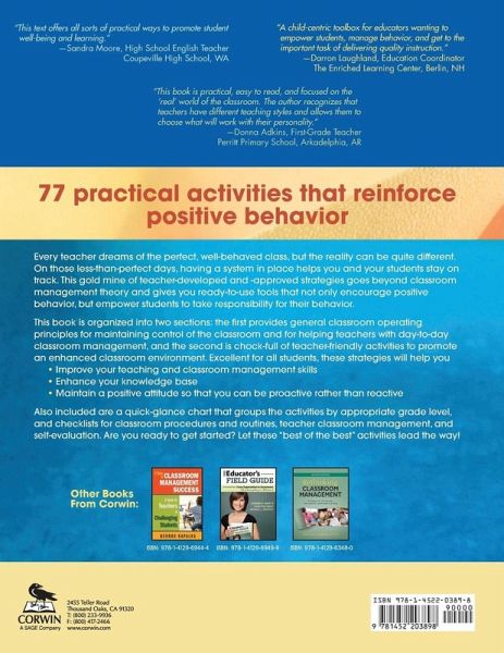77 practical activities that reinforce positive behavior This gold mine of teacher-developed and -approved activities goes beyond classroom management theory and gives you ready-to-use tools that not only encourage positive behavior, but also empower students to take responsibility for their behavior. Excellent for all students, these activities will help you: Improve your teaching and classroom management skills Enhance your knowledge base Maintain a positive attitude so that you can be proactive rather than reactive Also included are a quick-glance chart that groups the activities by appropriate grade level and helpful checklists.