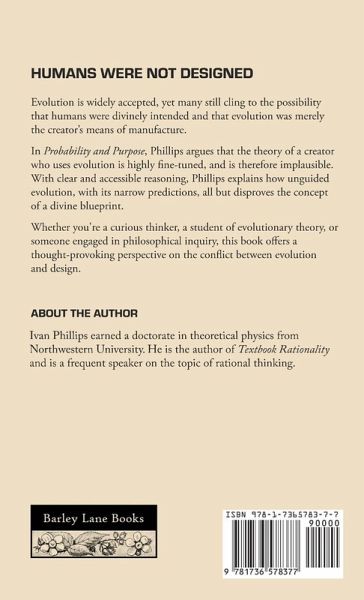 Humans were not designed Evolution is widely accepted, yet many still cling to the possibility that humans were divinely intended and that evolution was merely the creator's means of manufacture. In Probability and Purpose, Phillips argues that the theory of a creator who uses evolution is highly fine-tuned and is therefore implausible. With clear and accessible reasoning, Phillips explains how unguided evolution, with its narrow predictions, all but disproves the concept of a divine blueprint. Whether you're a curious thinker, a student of evolutionary theory, or someone engaged in philosophical inquiry, this book offers a thought-provoking perspective on the conflict between evolution and design.