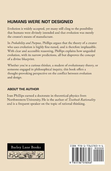 Humans were not designed... Evolution is widely accepted, yet many still cling to the possibility that humans were divinely intended and that evolution was merely the creator's means of manufacture. In Probability and Purpose, Phillips argues that the theory of a creator who uses evolution is highly fine-tuned, and is therefore implausible. With clear and accessible reasoning, Phillips explains how unguided evolution, with its narrow predictions, all but disproves the concept of a divine blueprint. Whether you're a curious thinker, a student of evolutionary theory, or someone engaged in philosophical inquiry, this book offers a thought-provoking perspective on the conflict between evolution and design. About the Author Ivan Phillips earned a doctorate in theoretical physics from Northwestern University. He is the author of Textbook Rationality and is a frequent speaker on the topic of rational thinking.