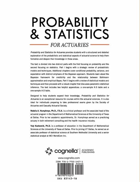 Probability and Statistics for Actuaries provides students with a structured and detailed explanation of the probabilistic and statistical aspects of actuarial science to help them formalize and deepen their knowledge in these areas. The text is divided into two distinct parts with the first focusing on probability and the second focusing on statistics. Part I begins with a strategic review of probabilistic models and techniques. Additional chapters cover conditional probability, variance, and expectation with distinct emphasis of the Bayesian approach. Students learn about the Bayesian framework for credibility and the relationship between Bühlmann approximation and empirical Bayes. Part II begins with a review of statistical models and techniques and then proceeds with a robust chapter that discusses parametric statistical inference. The text includes two helpful appendices: a one-sample K-S table and a one-sample A-D table. Designed to help students expand their knowledge, Probability and Statistics for Actuaries is an exceptional resource for courses within the actuarial sciences. It is also ideal for individuals preparing to take professional exams given by the Society of Actuaries and Casualty Actuarial Society.