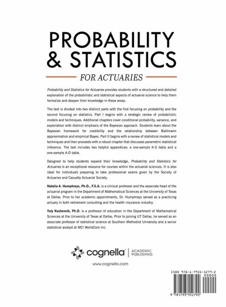 Probability and Statistics for Actuaries provides students with a structured and detailed explanation of the probabilistic and statistical aspects of actuarial science to help them formalize and deepen their knowledge in these areas. The text is divided into two distinct parts with the first focusing on probability and the second focusing on statistics. Part I begins with a strategic review of probabilistic models and techniques. Additional chapters cover conditional probability, variance, and expectation with distinct emphasis of the Bayesian approach. Students learn about the Bayesian framework for credibility and the relationship between Bühlmann approximation and empirical Bayes. Part II begins with a review of statistical models and techniques and then proceeds with a robust chapter that discusses parametric statistical inference. The text includes two helpful appendices: a one-sample K-S table and a one-sample A-D table. Designed to help students expand their knowledge, Probability and Statistics for Actuaries is an exceptional resource for courses within the actuarial sciences. It is also ideal for individuals preparing to take professional exams given by the Society of Actuaries and Casualty Actuarial Society.