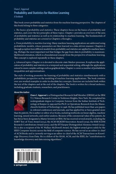 1. The basics of probability and statistics: These chapters focus on the basics of probability and statistics, and cover the key principles of these topics. Chapter 1 provides an overview of the area of probability and statistics as well as its relationship to machine learning. The fundamentals of probability and statistics are covered in Chapters 2 through 5.