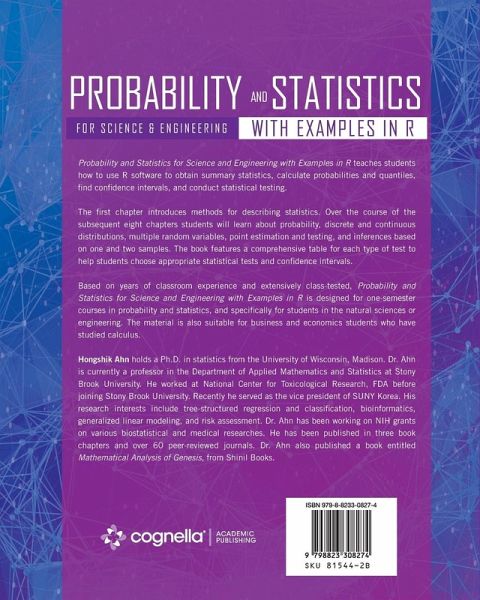 Probability and Statistics for Science and Engineering with Examples in R teaches students how to use R software to obtain summary statistics, calculate probabilities and quantiles, find confidence intervals, and conduct statistical testing. The first chapter introduces methods for describing statistics. Over the course of the subsequent eight chapters students will learn about probability, discrete and continuous distributions, multiple random variables, point estimation and testing, and inferences based on one and two samples. The book features a comprehensive table for each type of test to help students choose appropriate statistical tests and confidence intervals. Based on years of classroom experience and extensively class-tested, Probability and Statistics for Science and Engineering with Examples in R is designed for one-semester courses in probability and statistics, and specifically for students in the natural sciences or engineering. The material is also suitable for business and economics students who have studied calculus.