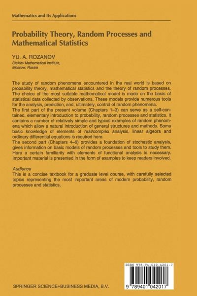 Probability Theory, Theory of Random Processes and Mathematical Statistics are important areas of modern mathematics and its applications. They develop rigorous models for a proper treatment for various 'random' phenomena which we encounter in the real world. They provide us with numerous tools for an analysis, prediction and, ultimately, control of random phenomena. Statistics itself helps with choice of a proper mathematical model (e.g., by estimation of unknown parameters) on the basis of statistical data collected by observations. This volume is intended to be a concise textbook for a graduate level course, with carefully selected topics representing the most important areas of modern Probability, Random Processes and Statistics. The first part (Ch. 1-3) can serve as a self-contained, elementary introduction to Probability, Random Processes and Statistics. It contains a number of relatively sim ple and typical examples of random phenomena which allow a natural introduction ofgeneral structures and methods. Only knowledge of elements of real/complex analysis, linear algebra and ordinary differential equations is required here. The second part (Ch. 4-6) provides a foundation of Stochastic Analysis, gives information on basic models of random processes and tools to study them. Here a familiarity with elements of functional analysis is necessary. Our intention to make this course fast-moving made it necessary to present important material in a form of examples.