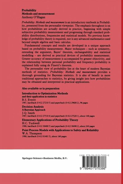 This book is an elementary and practical introduction to probability theory. It differs from other introductory texts in two important respects. First, the per sonal (or subjective) view of probability is adopted throughout. Second, emphasis is placed on how values are assigned to probabilities in practice, i.e. the measurement of probabilities. The personal approach to probability is in many ways more natural than other current formulations, and can also provide a broader view of the subject. It thus has a unifying effect. It has also assumed great importance recently because of the growth of Bayesian Statistics. Personal probability is essential for modern Bayesian methods, and it can be difficult for students who have learnt a different view of probability to adapt to Bayesian thinking. This book has been produced in response to that difficulty, to present a thorough introduction to probability from scratch, and entirely in the personal framework.
