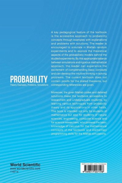 A key pedagogical feature of the textbook is the accessible approach to probability concepts through examples with explanations and problems with solutions. The reader is encouraged to simulate in Matlab random experiments and to explore the theoretical aspects of the probabilistic models behind the studied experiments. By this appropriate balance between simulations and rigorous mathematical approach, the reader can experience the excitement of comprehending basic concepts and can develop the intuitive thinking in solving problems. The current textbook does not contain proofs for the stated theorems, but corresponding references are given. Moreover, the given Matlab codes and detailed solutions make the textbook accessible to researchers and undergraduate students, by learning various techniques from probability theory and its applications in other fields. This book is intended not only for students of mathematics but also for students of natural sciences, engineering, computer science and for science researchers, who possess the basic knowledge of calculus for the mathematical concepts of the textbook and elementary programming skills for the Matlab simulations.