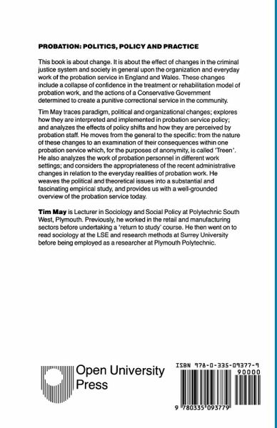 This book is about change. It is about the effect of changes in the criminal justice system and society in general upon the organization and everyday work of the probation service in England and Wales. These changes include a collapse in confidence in the treatment or rehabilitation model of probation work, and the actions of a Conservative government determined to create a punitive correctional service in the community. The author traces paradigm, political and organizational changes; explores how they are interpreted and implemented in probation service policy; and analyzes the effects of policy shifts and how they are percieved by probation staff. The author moves from the general to the specific: from the nature of these changes to an examination of their consequences within one probation service which, for the purposes of anonymity, is called "Treen". The book also analyzes the work of probation personnel in different work settings; and considers the appropriateness of the recent administrative changes in relation to the everyday realities of probation work.