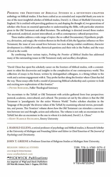 Probing the Frontiers of Biblical Studies is a seventeen-chapter anthology on biblical studies. It has been crafted as an extended and respectful thank you note to one of the most insightful scholars of biblical studies, David J. A. Clines of Sheffield University in England. He is credited with providing guidance to, and shaping the thought of, two generations of scholars who focus on essential approaches to understanding the Bible, with particular attention given to the Old Testament and allied literature. The anthology is directed toward those readers with pastoral, analytical, ancient intercultural, as well as contemporary cultural perspectives. Essays address a wide range of topics: the so-called Documentary Hypothesis, prophecy, divination, and magic, the wisdom themes in the Book of Job, the Egyptian influence on New Testament, the issue of non-sexual love between two men during combat conditions, character development in a biblical novella, rhetorical questions and their role in the Psalter, and the ways of God in the world. By combining these various topics, Probing the Frontier of Biblical Studies has addressed many of the outstanding issues in Old Testament study and ancillary disciplines.