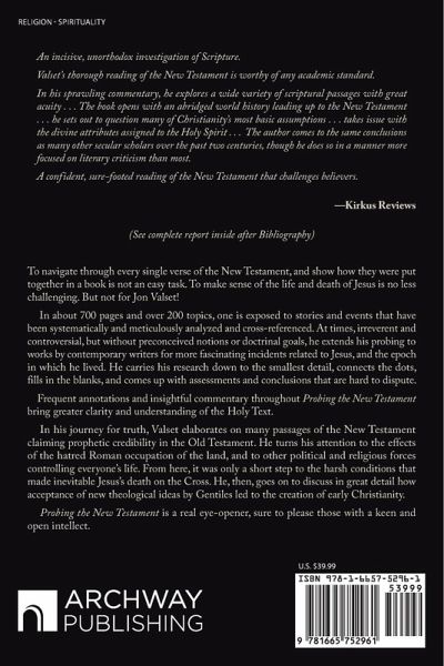 To navigate through every single verse of the New Testament, and show how they were put together in a book is not an easy task. To make sense of the life and death of Jesus is no less challenging. But not for Jon Valset! In about 700 pages and over 200 topics, one is exposed to stories and events that have been systematically and meticulously analyzed and cross-referenced. At times, irreverent and controversial, but without preconceived notions or doctrinal goals, he extends his probing to works by contemporary writers for more fascinating incidents related to Jesus, and the epoch in which he lived. He carries his research down to the smallest detail, connects the dots, fills in the blanks, and comes up with assessments and conclusions that are hard to dispute. Frequent annotations and insightful commentary throughout Probing the New Testament bring greater clarity and understanding of the Holy Text. In his journey for truth, Valset elaborates on many passages of the New Testament claiming prophetic credibility in the Old Testament. He turns his attention to the effects of the hatred Roman occupation of the land, and to other political and religious forces controlling everyone's life. From here, it was only a short step to the harsh conditions that made inevitable Jesus's death on the Cross. He, then, goes on to discuss in great detail how acceptance of new theological ideas by Gentiles led to the creation of early Christianity. Probing the New Testament is a real eye-opener, sure to please those with a keen and open intellect.