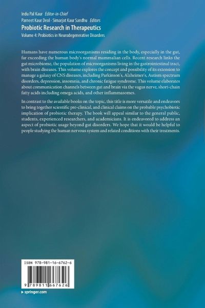 Chapter 1: Gut-Brain Axis: Role of Gut Microbiota.- Chapter 2: Critical Inspection of the Gut-Brain-Skin Triangle and its Modulation through Probiotics.- Chapter 3: Therapeutic mechanisms of gut microbiota and probiotics in the management off mental disorders.- Chapter 4: Pathophysiological role of gut microbiota affecting gut-brain axis and Intervention of Probiotics & Prebiotics in Autism spectrum disorder.- Chapter 5: Probiotics ameliorate gut-brain dysbiosis in autism spectrum disorder by modulating Nrf2-Keap1 signalling pathway.- Chapter 6: Psychobiotics for manipulating gut-brain-axis in Alzheimer's disease.- Chapter 7: Probiotic supplementation in major depressive disorders.- Chapter 8: Gut Dysbiosis in Insomnia and Diurnal Cycle.- Chapter 9: Role of gut microbiota and probiotic in chronic fatigue syndrome.- Chapter 10: Animal models used for studying the benefits of probiotics in neurodegeneration.