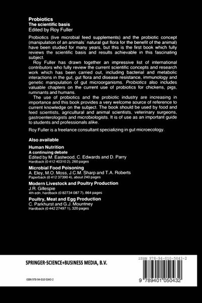 1 History and development of probiotics.- 1.1 Introduction.- 1.2 History.- 1.3 Composition of probiotic preparations.- References.- 2 Bacterial interactions in the gut.- 2.1 Introduction.- 2.2 Methods for studying bacterial interactions.- 2.3 Main types of bacterial interactions in the gut.- 2.3 Conclusions.- References.- 3 Metabolic interactions in the gut.- 3.1 Introduction.- 3.2 Mammalian intestinal metabolism.- 3.3 Gut bacterial metabolism.- 3.4 Conclusions.- References.- 4 Translocation and the indigenous gut flora.- 4.1 Introduction.- 4.2 Defence against bacterial translocation.- 4.3 Bacterial translocation in animal models with multiple deficiencies in host defences.- 4.4 Conclusion.- References.- 5 Gut flora and disease resistance.- 5.1 Introduction.- 5.2 Colonization resistance.- 5.3 Suppression of the multiplication of pathogens by the intestinal microflora.- 5.4 Mechanisms responsible for suppression of pathogens.- 5.5 Conclusions.- 5.6 The probiotic concept.- References.- 6 Factors affecting the microecology of the gut.- 6.1 Introduction.- 6.2 Definitions.- 6.3 Use of one or a limited number of bacterial strains in probiotic preparations.- 6.4 Ecological considerations.- 6.5 Recommendations for future developments.- References.- 7 Probiotics and the immune state.- 7.1 Introduction.- 7.2 Effect of orally administered lactic acid bacteria on immunity: non-specific and specific immune response.- 7.3 Effect of oral administration on the secretory immune system.- 7.4 Effect on the protection against enteric infections.- References.- 8 Genetit manipulation of gut microorganisms.- 8.1 Introduction.- 8.2 Microbes of potential interest.- 8.3 Molecular genetical studies.- 8.4 Stability of genetic determinants.- 8.5 Possible developments.- 8.6 Release of genetically modified microbes.- 8.7 Conclusions.- References.- 9 Selection of strains for probiotic use.- 9.1 Introduction.- 9.2 Aim of this chapter.- 9.3 First steps in the choice of microbial strains.- 9.4 Species and viability of probiotic microorganisms.- 9.5 Processing of viable microorganisms to end-products.- 9.6 Resistance to in vivo conditions.- 9.7 Adherence and colonization.- 9.8 Antimicrobial activity.- 9.9 Gene technology.- 9.10 Conclusion.- References.- 10 Probiotics for chickens.- 10.1 Introduction.- 10.2 The normal intestinal flora of poultry.- 10.3 Host-microbial flora interactions.- 10.4 The application of probiosis to poultry.- 10.5 Lactic acid bacteria as probiotics.- 10.6 Competitive exclusion.- 10.7 Immunity.- 10.8 Bacteriophages.- 10.9 Summary.- References.- 11 Probiotics for pigs.- 11.1 Introduction.- 11.2 Special features of pigs relevant to the use of probiotics.- 11.3 Current use of probiotics.- 11.4 Efficacy.- 11.5 Functional characteristics of potential probiotic strains.- 11.6 General discussion.- References.- 12 Probiotics for ruminants.- 12.1 Introduction.- 12.2 Probiotics for young ruminants.- 12.3 Fungal feed additives for adult ruminants.- 12.4 Bacterial probiotics for adult ruminants.- 12.5 Future developments.- References.- 13 Probiotics for humans.- 13.1 Introduction.- 13.2 Colonization of the gastrointestinal tract.- 13.3 Current use of probiotics.- 13.4 Nutritional benefits of probiotics.- 13.5 Therapeutic benefits of probiotics.- 13.6 More recent developments in the area of probiotics and health.- 13.7 Properties required for probiotics to be effective in nutritional and therapeutic settings.- 13.8 Future development of probiotics for human use.- 13.9 Future applications of probiotics.- 13.10 Techniques for probiotic modification.-References.- 14 Problems and prospects.- 14.1 Introduction.- 14.2 Factors affecting the probiotic response.- 14.3 Future developments.- 14.4 Summary.- References.