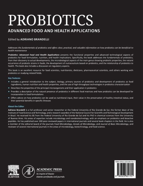 1. An introduction to probiotics 2. Prebiotics and synbiotics 3. Microorganisms with food applications as probiotics 4. Beneficial microbes from human and animal intestines 5. High-throughput technologies in probiotics science 6. Probiotics in milk and dairy foods 7. Probiotics in meat products 8. Development of high-protein whey-based beverage rich in probiotics 9. Effect of food ingredients on susceptible gut indigenous bacteria 10. Encapsulation of probiotics 11. Prospective applications of probiotics and prebiotics in foods 12. Food-gut microbiota interactions 13. Food-based probiotics: functional dietary ingredients 14. Probiotics in sports nutrition 15. Impact of probiotic supplementation and the role of gut microbiome in obesity 16. Immunomodulatory and anti-inflammatory mechanisms of probiotics 17. Probiotics and intestinal health 18. Probiotics and urogenital health 19. Probiotics and skin health 20. Probiotics in the management of diabetes 21. Probiotics in pediatrics 22. Probiotics and the gut-brain axis 23. Probiotics and the gut-liver axis 24. Next generation probiotics