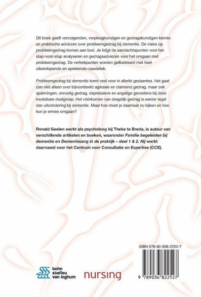 Dit boek geeft verzorgenden, verpleegkundigen en gedragskundigen kennis en praktische adviezen over probleemgedrag bij dementie. De visies op probleemgedrag komen aan bod. Je krijgt de aandachtspunten voor het stap-voor-stap analyseren en gedragsadviezen voor het omgaan met probleemgedrag. De vertrekpunten worden geïllustreerd met heel uiteenlopende en sprekende casuïstiek. Probleemgedrag bij dementie komt veel voor in allerlei gedaantes. Het gaat dan niet alleen over bijvoorbeeld agressie en claimend gedrag, maar ook spanningen, onrustig gedrag, depressieve en angstige gevoelens bij deze kwetsbare doelgroep. Het vóórkomen van dergelijk gedrag is eerder regel dan uitzondering bij dementie. Maar hoe moet je daarnaar nu kijken en hoe kun je ermee omgaan? Ronald Geelen werkt als psycholoog bij Thebe te Breda, is auteur van verschillende artikelen en boeken, waaronder Familie begeleiden bij dementie en Dementiezorg in de praktijk ¿ deel 1 & 2. Hij werkt daarnaast voor het Centrum voor Consultatie en Expertise (CCE).