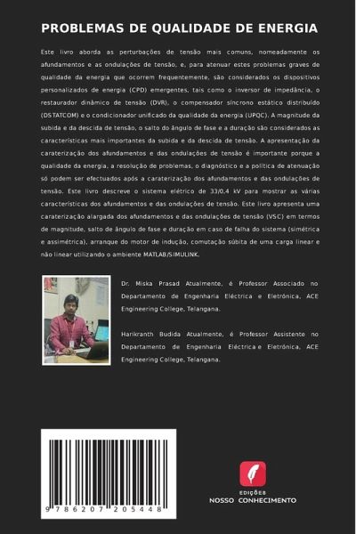 Este livro aborda as perturbações de tensão mais comuns, nomeadamente os afundamentos e as ondulações de tensão, e, para atenuar estes problemas graves de qualidade da energia que ocorrem frequentemente, são considerados os dispositivos personalizados de energia (CPD) emergentes, tais como o inversor de impedância, o restaurador dinâmico de tensão (DVR), o compensador síncrono estático distribuído (DSTATCOM) e o condicionador unificado da qualidade da energia (UPQC). A magnitude da subida e da descida de tensão, o salto do ângulo de fase e a duração são considerados as características mais importantes da subida e da descida de tensão. A apresentação da caraterização dos afundamentos e das ondulações de tensão é importante porque a qualidade da energia, a resolução de problemas, o diagnóstico e a política de atenuação só podem ser efectuados após a caraterização dos afundamentos e das ondulações de tensão. Este livro descreve o sistema elétrico de 33/0,4 kV para mostrar as várias características dos afundamentos e das ondulações de tensão. Este livro apresenta uma caraterização alargada dos afundamentos e das ondulações de tensão (VSC) em termos de magnitude, salto de ângulo de fase e duração em caso de falha do sistema (simétrica e assimétrica), arranque do motor de indução, comutação súbita de uma carga linear e não linear utilizando o ambiente MATLAB/SIMULINK.