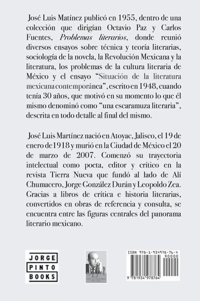 José Luis Matínez publicó en 1955, dentro de una colección que dirigían Octavio Paz y Carlos Fuentes, Problemas literarios, donde reunió diversos ensayos sobre técnica y teoría literarias, sociología de la novela, la Revolución Mexicana y la literatura, los problemas de la cultura literaria de México y el ensayo "Situación de la literatura mexicana contemporánea", escrito en 1948, cuando tenía 30 años, que motivó en su momento lo que él mismo denominó como "una escaramuza literaria", descrita en todo detalle al final del mismo. José Luis Martíneznació en Atoyac, Jalisco, el 19 de enero de1918 y murió en la Ciudad de México el 20 de marzo de 2007. Comenzó su trayectoria intelectual como poeta, editor y crítico en la revista Tierra Nueva que fundó al lado de Alí Chumacero, Jorge González Durán y Leopoldo Zea. Gracias a libros de crítica e historia literarias, convertidos en obras de referencia y consulta, se encuentra entre las figuras centrales del panorama literario mexicano. "El legado de su biblioteca personal, ahora pública, solo es comparable a su labor como editor, crítico e historiador. Convirtió su pasión por la lectura en un servicio a la sociedad." Rodrigo Martínez BaracsLetras Libres,Enero, 2018 "…mi Maestro Martínez fue un lector insaciable, ensayista de absoluta claridad, historiador de minuciosos rigores, uno de los mejores cronistas que ha tenido la Ciudad de México y la literatura mexicana, pero sobre todo, un entrañable Maestro con mayúsculas. Sus biografías de Nezahualcóyotly Hernán Cortés(amparada sobre cuatro extensos volúmenes que reúnen todos los papeles posibles sobre el conquistador de México) serán siempre lectura indispensable y el ancho mapa que nos hereda de todos los libros mexicanos escritos y publicados desde tiempo inmemorial hasta los albores del siglo XXI servirá para siempre de guía para navegación de nuestras letras y apuntalamiento de nuestra más íntima memoria. Jorge H. Hernández. EL hombre que fue todos los libros, Cartas de Cuévano, diario El Pais, X/ IV/ MMXVIII JLM, "Gracias a libros de crítica e historia literarias, convertidos en obras de referencia y consulta, se encuentra entre las figuras centrales del panorama literario mexicano." José Luís Martínez Hernández. Presentación, 2018