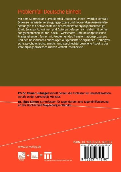 Mit dem Sammelband "Problemfall Deutsche Einheit" werden zentrale Diskurse im Wiedervereinigungsprozess und notwendige Auseinandersetzungen mit Schwachstellen des Wiedervereinigungsprozesses geführt. Zwanzig Autorinnen und Autoren befassen sich dabei mit verfassungsrechtlichen, kultur-, sozial-, wirtschafts- und umweltpolitischen Fragestellungen, ferner mit Problemen des Transformationsprozesses und den besonderen Lebenslagen ausgesuchter Zielgruppen. Demografische, psychologische, armuts- und geschlechterbezogene Aspekte des Vereinigungsprozesses rücken vertieft ins Blickfeld.