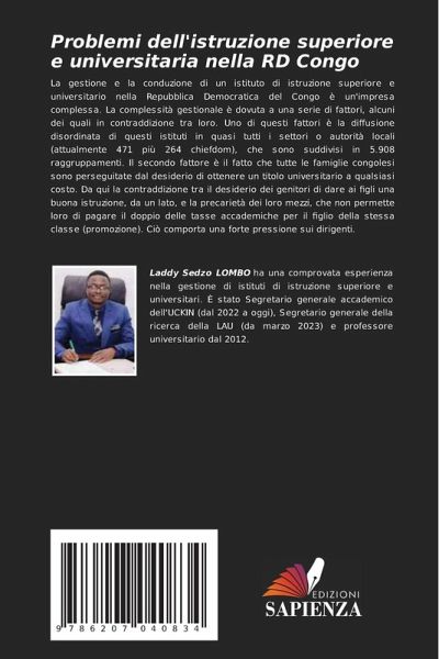 La gestione e la conduzione di un istituto di istruzione superiore e universitario nella Repubblica Democratica del Congo è un'impresa complessa. La complessità gestionale è dovuta a una serie di fattori, alcuni dei quali in contraddizione tra loro. Uno di questi fattori è la diffusione disordinata di questi istituti in quasi tutti i settori o autorità locali (attualmente 471 più 264 chiefdom), che sono suddivisi in 5.908 raggruppamenti. Il secondo fattore è il fatto che tutte le famiglie congolesi sono perseguitate dal desiderio di ottenere un titolo universitario a qualsiasi costo. Da qui la contraddizione tra il desiderio dei genitori di dare ai figli una buona istruzione, da un lato, e la precarietà dei loro mezzi, che non permette loro di pagare il doppio delle tasse accademiche per il figlio della stessa classe (promozione). Ciò comporta una forte pressione sui dirigenti.