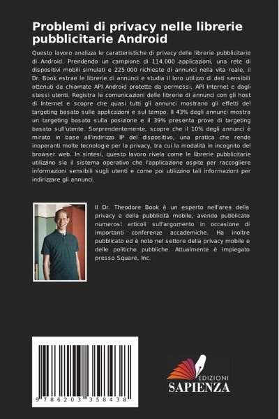 Questo lavoro analizza le caratteristiche di privacy delle librerie pubblicitarie di Android. Prendendo un campione di 114.000 applicazioni, una rete di dispositivi mobili simulati e 225.000 richieste di annunci nella vita reale, il Dr. Book estrae le librerie di annunci e studia il loro utilizzo di dati sensibili ottenuti da chiamate API Android protette da permessi, API Internet e dagli stessi utenti. Registra le comunicazioni delle librerie di annunci con gli host di Internet e scopre che quasi tutti gli annunci mostrano gli effetti del targeting basato sulle applicazioni e sul tempo. Il 43% degli annunci mostra un targeting basato sulla posizione e il 39% presenta prove di targeting basato sull'utente. Sorprendentemente, scopre che il 10% degli annunci è mirato in base all'indirizzo IP del dispositivo, una pratica che rende inoperanti molte tecnologie per la privacy, tra cui la modalità in incognito del browser web. In sintesi, questo lavoro rivela come le librerie pubblicitarie utilizzino sia il sistema operativo che l'applicazione ospite per raccogliere informazioni sensibili sugli utenti e come poi utilizzino tali informazioni per indirizzare gli annunci.