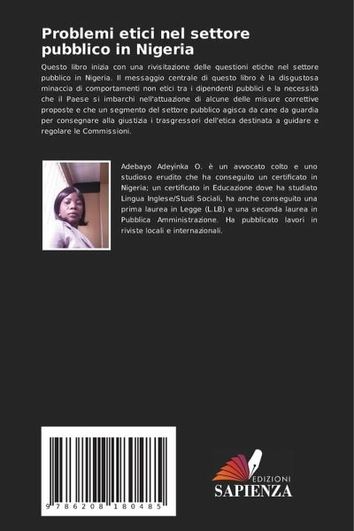 Questo libro inizia con una rivisitazione delle questioni etiche nel settore pubblico in Nigeria. Il messaggio centrale di questo libro è la disgustosa minaccia di comportamenti non etici tra i dipendenti pubblici e la necessità che il Paese si imbarchi nell'attuazione di alcune delle misure correttive proposte e che un segmento del settore pubblico agisca da cane da guardia per consegnare alla giustizia i trasgressori dell'etica destinata a guidare e regolare le Commissioni.
