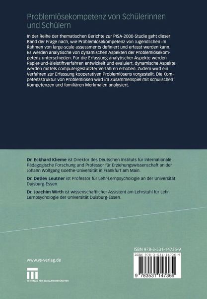 1 Problemlösefähigkeit als fächerübergreifende Kompetenz.- 1.1 Einleitung: Fächerübergreifende Kompetenzen als Gegenstand von PISA.- 1.2 Der Kompetenzbegriff bei PISA.- 1.3 Problemlösen als Konzept und Forschungsgegenstand der kognitiven Psychologie.- 1.4 Problemlösen als Konzept und Forschungsgegenstand der differenziellen Psychologie.- 1.5 Analytische und dynamische Aspekte des Problemlösens.- 1.6 Selbstregulation beim dynamischen Problemlösen.- 2 Ansätze zur Operationalisierung und deren Erprobung im Feldtest zu PISA 2000.- 2.1 Einleitung.- 2.2 Operationalisierung von Problemlösekompetenz.- 2.3 Empirische Erprobung im Feldtest.- 2.4 Zusammenfassende Diskussion.- 3 Analytisches Problemlösen: Messansatz und Befunde zu Planungs- und Entscheidungsaufgaben.- 3.1 Projektaufgaben: Konzeption und Auswertungsstrategie.- 3.2 Validität und Niveaustufen des analytischen Problemlösens.- 3.3 Analytische Problemlösekompetenz in Abhängigkeit von Schulform, Bundesland und Geschlecht.- 3.4 Fazit.- 4 Dynamisches Problemlösen: Entwicklung und Evaluation eines neuen Messverfahrens zum Steuern komplexer Systeme.- 4.1 Einleitung.- 4.2 Instrument und Leistungsmaße.- 4.3 Stichprobe und Durchführung.- 4.4 Eigenschaften/Qualität des Messinstruments.- 4.5 Regulation des Wissenserwerbs.- 4.6 Dynamisches Problemlösen.- 4.7 Dynamisches Problemlösen und Intelligenz.- 4.8 Zusammenfassung.- 5 Problemlösekompetenz - Ökonomisch und zugleich differenziert erfassbar?.- 5.1 Ökonomische Erfassung verschiedener Aspekte des Problemlösens.- 5.2 Aspekte des Problemlösens, fachliche Teilkompetenzen und Intelligenz.- 5.3 Zusammenfassende Diskussion.- 6 Die Bedeutung schulischer Bildung und soziobiographischer Merkmale für die Problemlösekompetenz.- 6.1 Analytisches Problemlösen.-6.2 Analytisches und dynamisches Problemlösen im Vergleich.- 6.3 Diskussion.- 7 Die Rolle von individuellen Eingangsvoraussetzungen und Gruppenmerkmalen beim kooperativen Lösen eines Problems.- 7.1 Kooperationsfähigkeit bei Schülerinnen und Schülern.- 7.2 Methode.- 7.3 Ergebnisse.- 7.4 Diskussion.- A Regulationsmaß des Wissenserwerbs (Joachim Wirth).- B Regulationsmaß der Wissensanwendung (Joachim Wirth).- C Auswertungsmethoden und zusätzliche Detailergebnisse (Johannes Hartig).- Literatur.- Abbildungsverzeichnis.- Tabellenverzeichnis.