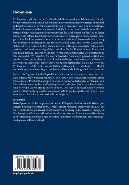 In der 2. Auflage wurden alle Kapitel überarbeitet und an den neuesten Kenntnisstand zum Thema Problemlösen angepasst. Die Kapitel zur schulischen und häuslichen Förderung der Problemlösekompetenz wurden stark erweitert und es werden nun eine Vielzahl an neuen Aufgaben und Spielen präsentiert, die beim Fördern von Problemlösen eine wertvolle Unterstützung leisten können. Das Kapitel zur Kombinatorik wurde nach der Rückmeldung von Studierenden und Kollegen komplett umstrukturiert und ist nun verständlicher und übersichtlicher aufgebaut.