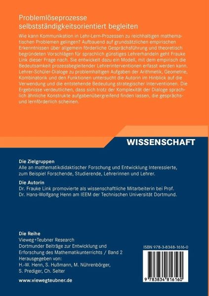 Wie kann Kommunikation in Lehr-Lern-Prozessen zu reichhaltigen mathematischen Problemen gelingen? Aufbauend auf grundsätzlichen empirischen Erkenntnissen über allgemein förderliche Gesprächsführung und theoretisch begründeten Vorschlägen für sprachlich günstiges Lehrerhandeln geht Frauke Link dieser Frage nach. Sie entwickelt dazu ein Modell, mit dem empirisch die Bedeutsamkeit prozessbegleitender Lehrinterventionen erfasst werden kann. Lehrer-Schüler-Dialoge zu problemhaltigen Aufgaben der Arithmetik, Geometrie, Kombinatorik und den Funktionen untersucht die Autorin im Hinblick auf die Verwendung und die entstehende Bedeutung strategischer Interventionen. Die Ergebnisse verdeutlichen, dass sich trotz der Komplexität der Dialoge sprachlich ähnliche Konstrukte aufgabenübergreifend finden lassen, die gesprächs- und lernförderlich scheinen.
