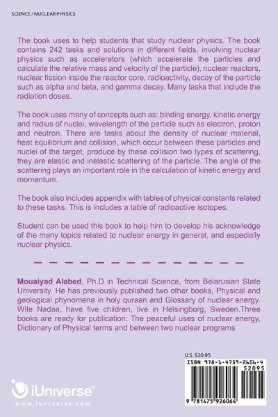 The book uses to help students that study nuclear physics. The book contains 242 tasks and solutions in different fields, involving nuclear physics such as accelerators (which accelerate the particles and calculate the relative mass and velocity of the particle), nuclear reactors, nuclear fission inside the reactor core, radioactivity, decay of the particle such as alpha and beta, and gamma decay. Many tasks that include the radiation doses. The book uses many of concepts such as: binding energy, kinetic energy and radius of nuclei, wavelength of the particle such as electron, proton and neutron. There are tasks about the density of nuclear material, heat equilibrium and collision, which occur between these particles and nuclei of the target, produce by these collision two types of scattering, they are elastic and inelastic scattering of the particle. The angle of the scattering plays an important role in the calculation of kinetic energy and momentum. The book also includes appendix with tables of physical constants related to these tasks. This is includes a table of radioactive isotopes. Student can be used this book to help him to develop his acknowledge of the many topics related to nuclear energy in general, and especially nuclear physics.