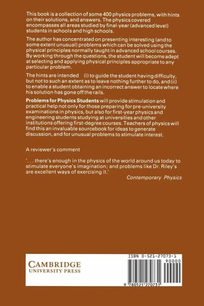 Preface; 1. Physical dimensions; 2. Linear mechanics and statics; 3. Circular and rotational motion; 4. Gravitation and circular orbits; 5. Simple harmonic motion; 6. Waves; 7. Geometrical optics; 8. Interference and diffraction; 9. Structure and properties of solids; 10. Properties of liquids; 11. Properties of gases; 12. Kinetic theory and statistical physics; 13. Heat transfer; 14. Electrostatics; 15. Direct currents; 16. Non-steady currents; 17. Magnetic fields and currents; 18. Electromagnetism; 19. Nuclei; 20. Electrons, photons and atoms; 21. Shorts; 22. Longs; 23. Data handling; 24. Guestimation; 25. Why or how; 26. Sophistry; Hints and intermediate answers; Answers; Appendix; Symbols and units; Formulae and relationships; Constants.