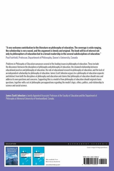Problems in Philosophy of Education canvasses several of the leading issues in philosophy of education. These include the disconnect between the disciplines of philosophy and philosophy of education, the strained relationship between educational practice and philosophy of education, the role of educational research in philosophy of education, and the lack of an independent scholarship for philosophy of education. James Scott Johnson argues for a philosophy of education separate and distinct from both the disciplines of philosophy and education and claims that philosophy of education should raise and address its own questions and concerns. Supporting this is a model of how philosophy of education should originate basic questions, together with a set of philosophic presuppositions regarding the model's logic, ethics, politics, and relationship to science and social science.