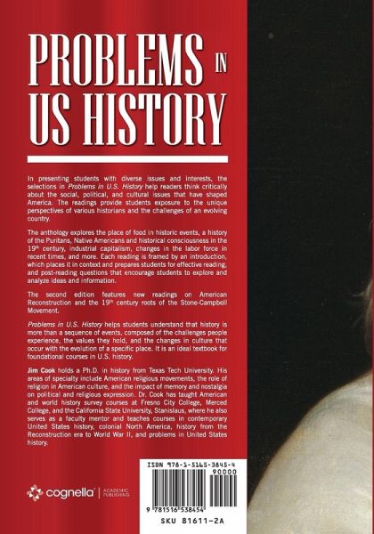 In presenting students with diverse issues and interests, the selections in Problems in U.S. History help readers think critically about the social, political, and cultural issues that have shaped America. The readings provide students exposure to the unique perspectives of various historians and the challenges of an evolving country. The anthology explores the place of food in historic events, a history of the Puritans, Native Americans and historical consciousness in the 19th century, industrial capitalism, changes in the labor force in recent times, and more. Each reading is framed by an introduction, which places it in context and prepares students for effective reading, and post-reading questions that encourage students to explore and analyze ideas and information. The second edition features new readings on American Reconstruction and the 19th century roots of the Stone-Campbell Movement. Problems in U.S. History helps students understand that history is more than a sequence of events, composed of the challenges people experience, the values they hold, and the changes in culture that occur with the evolution of a specific place. It is an ideal textbook for foundational courses in U.S. history. Jim Cook holds a Ph.D. in history from Texas Tech University. His areas of specialty include American religious movements, the role of religion in American culture, and the impact of memory and nostalgia on political and religious expression. Dr. Cook has taught American and world history survey courses at Fresno City College, Merced College, and the California State University, Stanislaus, where he also serves as a faculty mentor and teaches courses in contemporary United States history, colonial North America, history from the Reconstruction era to World War II, and problems in United States history.