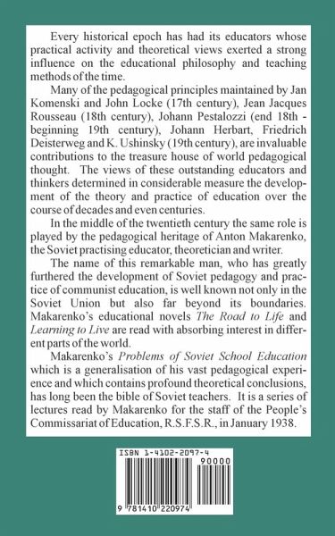 Every historical epoch has had its educators whose practical activity and theoretical views exerted a strong influence on the educational philosophy and teaching methods of the time. Many of the pedagogical principles maintained by Jan Komenski and John Locke (17th century), Jean Jacques Rousseau (18th century), Johann Pestalozzi (end 18th - beginning 19th century), Johann Herbart, Friedrich Deisterweg and K. Ushinsky (19th century), are invaluable contributions to the treasure house of world pedagogical thought. The views of these outstanding educators and thinkers determined in considerable measure the development of the theory and practice of education over the course of decades and even centuries. In the middle of the twentieth century the same role is played by the pedagogical heritage of Anton Makarenko, the Soviet practising educator, theoretician and writer. The name of this remarkable man, who has greatly furthered the development of Soviet pedagogy and practice of communist education, is well known not only in the Soviet Union but also far beyond its boundaries. Makarenko's educational novels The Road to Life and Learning to Live are read with absorbing interest in different parts of the world. Makarenko's Problems of Soviet School Education which is a generalisation of his vast pedagogical experience and which contains profound theoretical conclusions, has long been the bible of Soviet teachers. It is a series of lectures read by Makarenko for the staff of the People's Commissariat of Education, R.S.F.S.R., in January 1938.