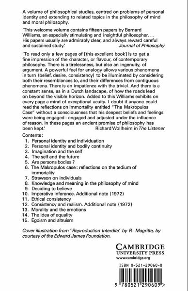 This is a volume of philosophical studies, centred on problems of personal identity and extending to related topics in the philosophy of mind and moral philosophy.