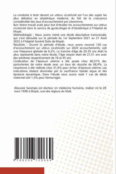 La conduite à tenir devant un utérus cicatriciel est l'un des sujets les plus débattus en obstétrique moderne, du fait de la croissance considérable des taux d'accouchement par césarienne.But: Notre travail avait pour but d'étudier les accouchements sur utérus cicatriciel dans le service de gynécologie et d'obstétrique à l'hôpital de Mopti.Méthodologie : Nous avons mené une étude descriptive transversale, qui s'est déroulée sur la période du 1er Septembre 2021 au 31 Août 2022 à l'hôpital Sominé Dolo de Mopti.Résultats : Durant la période d'étude, nous avons recensé 126 cas d'accouchement sur utérus cicatriciels sur 2029 accouchements; soit une fréquence globale de 6,2%. La tranche d'âge de 20-35 ans était la plus représenté dans notre étude, l'âge moyen était de 27,51 ans avec des extrêmes respectivement de 18 et 45 ans.L'indication de l'épreuve utérine a été posée chez 60,31% des parturientes de notre étude avec un taux de réussite de 68,4%. La césarienne a été réalisée chez 31,6% pour échec d'épreuve utérine. Les indications étaient dominées par la souffrance foetale aigue et des dystocie dynamique. Dans l'étude nous avons noté 1 cas de décès maternel soit 1,3% pour hémorragie.