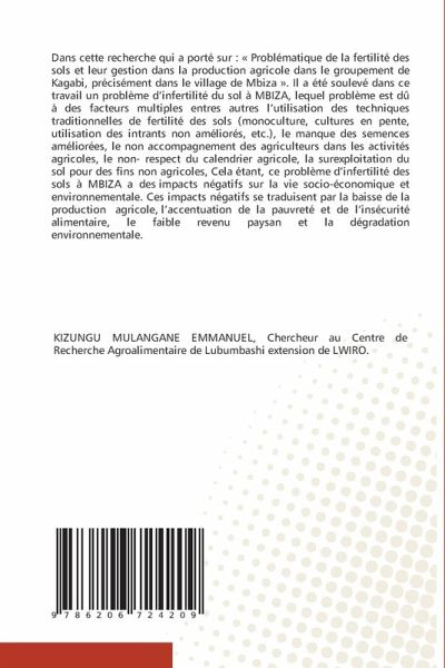 Dans cette recherche qui a porté sur : « Problématique de la fertilité des sols et leur gestion dans la production agricole dans le groupement de Kagabi, précisément dans le village de Mbiza ». Il a été soulevé dans ce travail un problème d'infertilité du sol à MBIZA, lequel problème est dû à des facteurs multiples entres autres l'utilisation des techniques traditionnelles de fertilité des sols (monoculture, cultures en pente, utilisation des intrants non améliorés, etc.), le manque des semences améliorées, le non accompagnement des agriculteurs dans les activités agricoles, le non- respect du calendrier agricole, la surexploitation du sol pour des fins non agricoles, Cela étant, ce problème d'infertilité des sols à MBIZA a des impacts négatifs sur la vie socio-économique et environnementale. Ces impacts négatifs se traduisent par la baisse de la production agricole, l'accentuation de la pauvreté et de l'insécurité alimentaire, le faible revenu paysan et la dégradation environnementale.