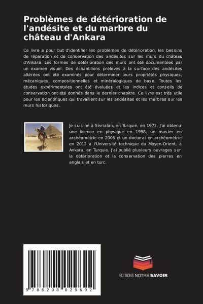 Ce livre a pour but d'identifier les problèmes de détérioration, les besoins de réparation et de conservation des andésites sur les murs du château d'Ankara. Les formes de détérioration des murs ont été documentées par un examen visuel. Des échantillons prélevés à la surface des andésites altérées ont été examinés pour déterminer leurs propriétés physiques, mécaniques, compositionnelles et minéralogiques de base. Toutes les études expérimentales ont été évaluées et les indices et conseils de conservation ont été donnés dans le dernier chapitre. Ce livre est très utile pour les scientifiques qui travaillent sur les andésites et les marbres sur les murs historiques.