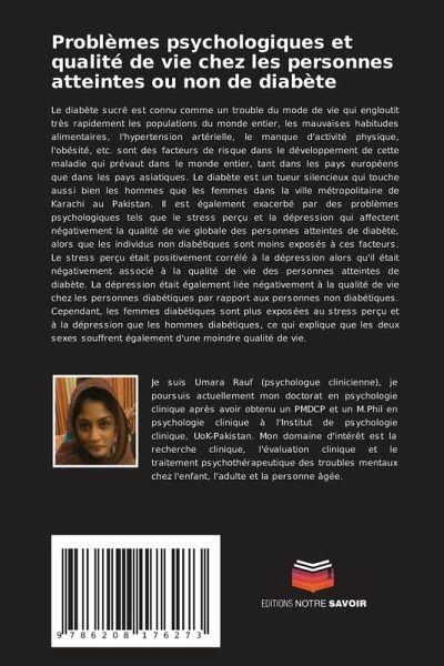 Le diabète sucré est connu comme un trouble du mode de vie qui engloutit très rapidement les populations du monde entier, les mauvaises habitudes alimentaires, l'hypertension artérielle, le manque d'activité physique, l'obésité, etc. sont des facteurs de risque dans le développement de cette maladie qui prévaut dans le monde entier, tant dans les pays européens que dans les pays asiatiques. Le diabète est un tueur silencieux qui touche aussi bien les hommes que les femmes dans la ville métropolitaine de Karachi au Pakistan. Il est également exacerbé par des problèmes psychologiques tels que le stress perçu et la dépression qui affectent négativement la qualité de vie globale des personnes atteintes de diabète, alors que les individus non diabétiques sont moins exposés à ces facteurs. Le stress perçu était positivement corrélé à la dépression alors qu'il était négativement associé à la qualité de vie des personnes atteintes de diabète. La dépression était également liée négativement à la qualité de vie chez les personnes diabétiques par rapport aux personnes non diabétiques. Cependant, les femmes diabétiques sont plus exposées au stress perçu et à la dépression que les hommes diabétiques, ce qui explique que les deux sexes souffrent également d'une moindre qualité de vie.