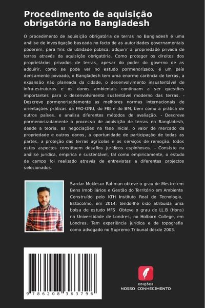O procedimento de aquisição obrigatória de terras no Bangladesh é uma análise de investigação baseada no facto de as autoridades governamentais poderem, para fins de utilidade pública, adquirir a propriedade privada de terras através da aquisição obrigatória. Como proteger os direitos dos proprietários privados de terras, apesar do poder do governo de as adquirir, como se pode ver no estudo pormenorizado, é um país densamente povoado, o Bangladesh tem uma enorme carência de terras, a expansão não planeada da cidade, o desenvolvimento insustentável de infra-estruturas e os danos ambientais continuam a ser questões importantes para o desenvolvimento sustentável moderno das terras. - Descreve pormenorizadamente as melhores normas internacionais de orientações práticas da FAO-ONU, do FIG e do BM, bem como a prática de outros países, e analisa diferentes métodos de avaliação. - Descreve pormenorizadamente o processo de aquisição de terras no Bangladesh, desde a teoria, as negociações na fase inicial, o valor de mercado da propriedade e outros danos, a oportunidade de participação de todas as partes, a proteção das terras agrícolas e os serviços de remoção, todos estes aspectos constituem desafios jurídicos espinhosos. - Consiste na análise jurídica, empírica e sustentável, tal como empiricamente, o estudo de campo foi realizado através de entrevistas a diferentes projectos selecionados.